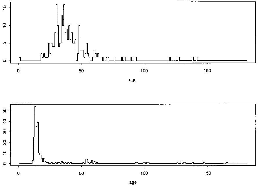 Fig. 2. Distribution of (top) age at autism diagnosis and (bottom) age at vaccination (in months), of 231 children with autism who received a single dose of MMR vaccine.